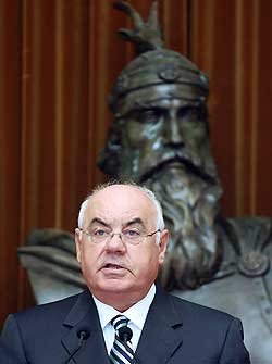 How widespread is corruption in Albania? Speaking at a news conference in Tirana on Oct. 14, Albanian President Alfred Moisiu refused to dismiss the country's attorney general, Theodhori Sollaku, accused by Prime Minister Sali Berisha of being linked to organized crime. Since the collapse of communism in the early 1990's, Albania has been the source of heavy trafficking to the European Union of illegal immigrants, prostitutes, drugs, and weapons. (Photo: Gent Shkullaku / AFP-Getty Images) |